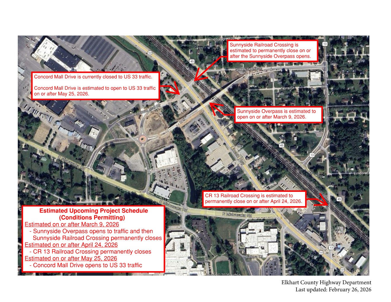 The Sunnyside Overpass is scheduled to open on or after March 9, 2026. The Sunnyside Avenue Railroad Crossing is estimated to permanently close on or after the Sunnyside Overpass opens to traffic. CR 13 Railroad Crossing is estimated to permanently close on or after April 24, 2026. Concord Mall Drive is currently closed to US 33 traffic and is estimated to open to US 33 traffic on or after May 25, 2026.